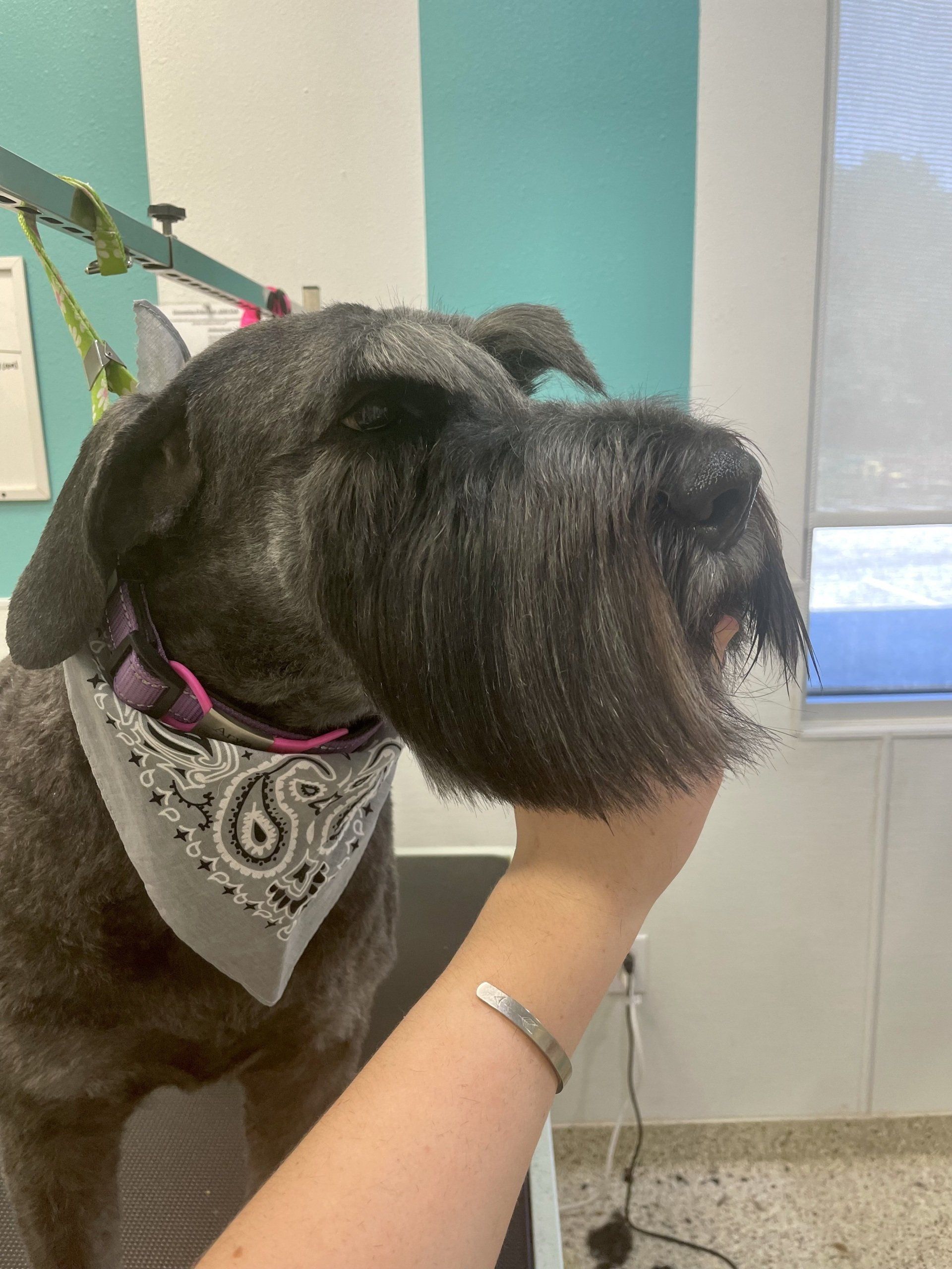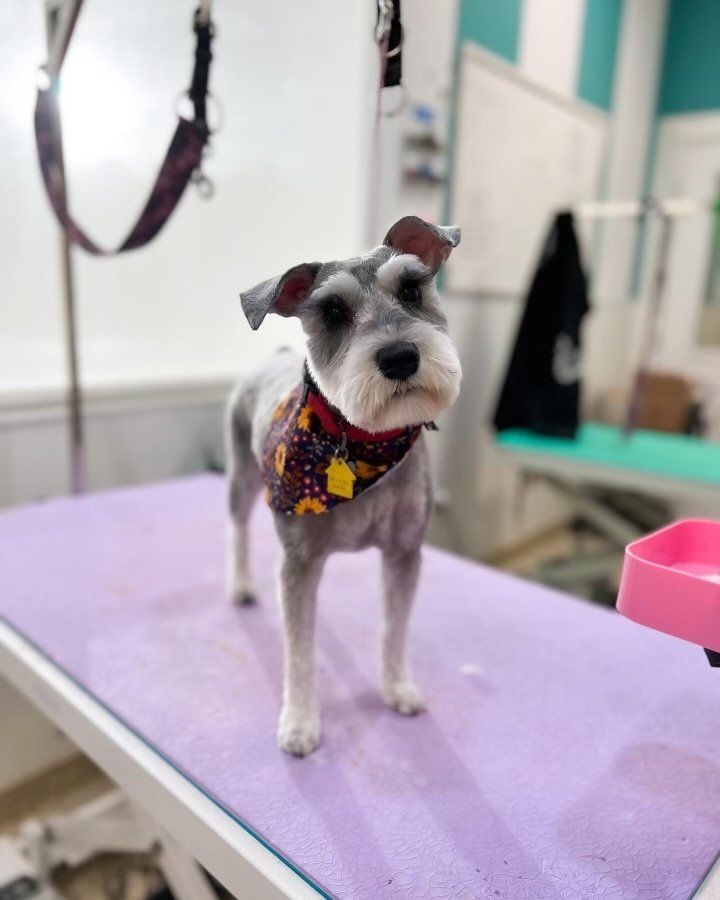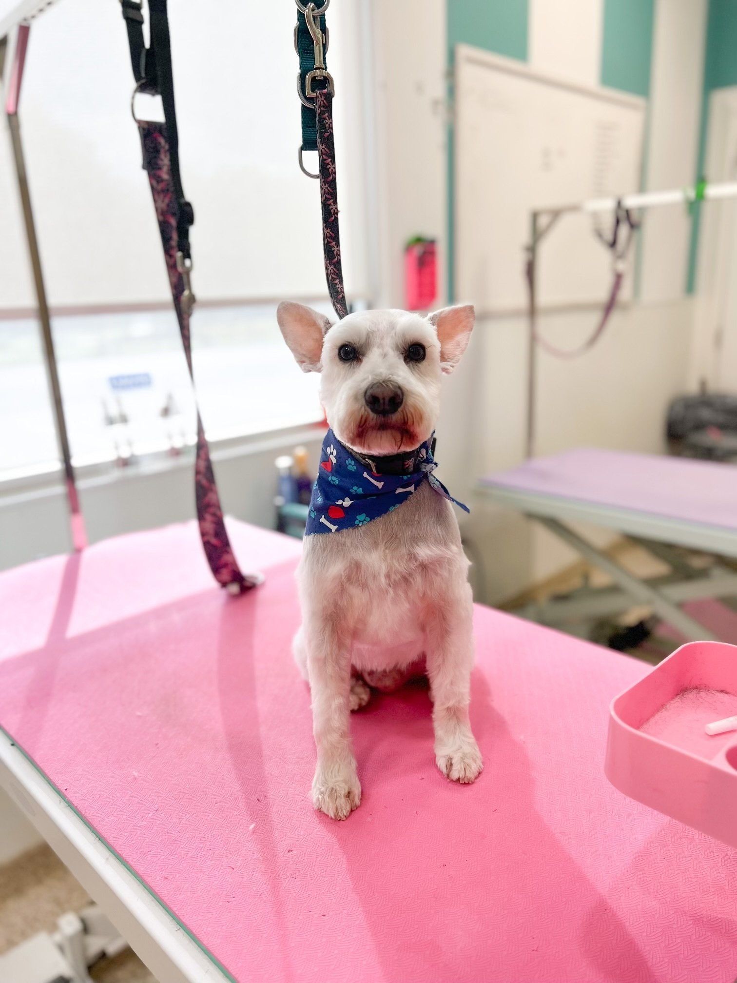 The bath price includes the bath with two shampoos and a conditioner, blow-dry with our high-velocity dryer, nail trim, and an ear clean. Topped off with doggie perfume and a bandana.